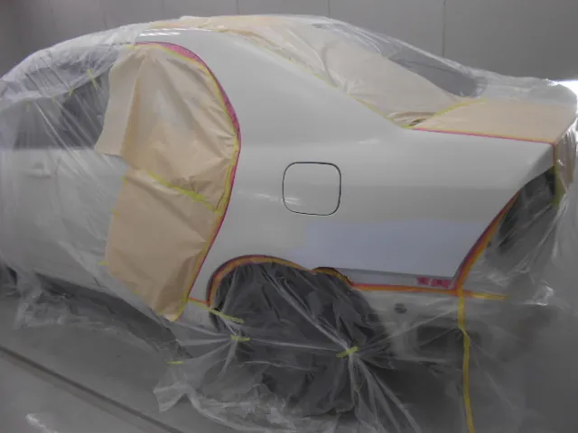 リアフェンダーの形が直りました。マスキング作業をしてボディーカラーの塗装です。
