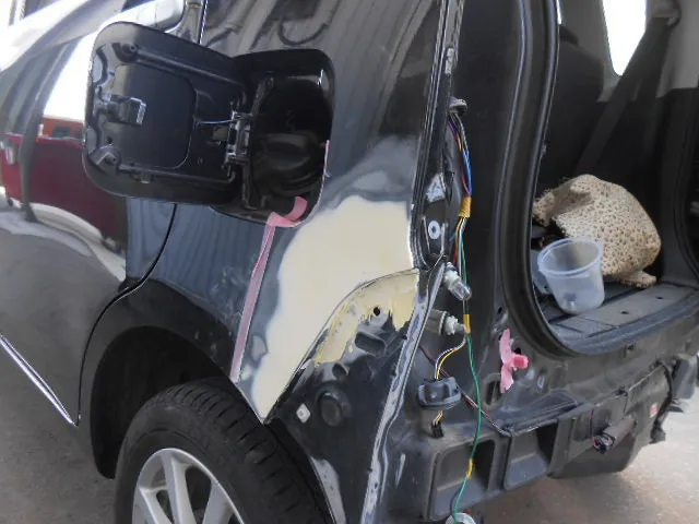 バンパーが押されてリヤフェンダーが歪んでへこんでいます。板金修理していきます。