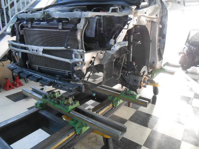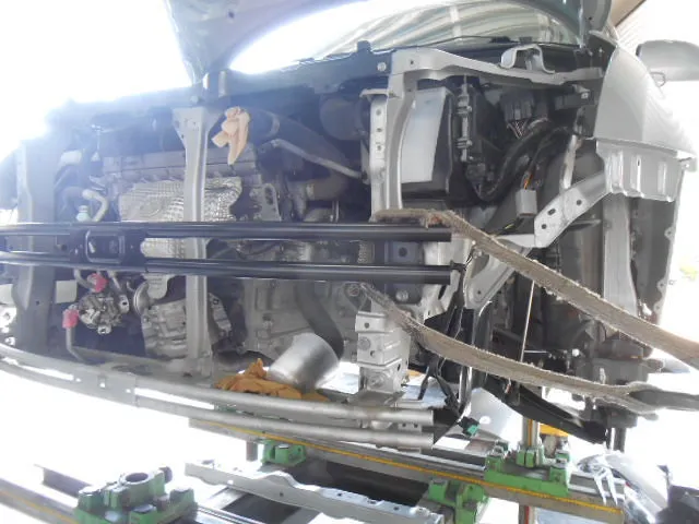 ジグフレーム修正機にセットし、車体の寸法を計測しながら損傷部位を調べます。