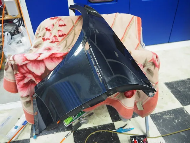 フロントフェンダーを取り外しました。フロントフェンダーを取り外すには、バンパーを外し、ヘッドランプを外し、サイドモールを外し、フェンダーが外せます。なかなか簡単には外せません。
