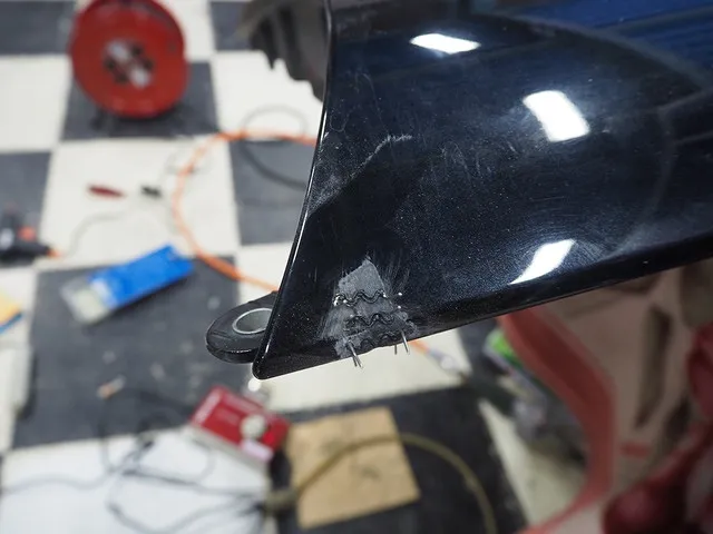 フロントフェンダーは樹脂製です。割れてしまった箇所を修理して塗装します。
