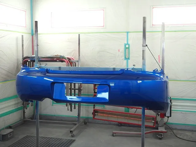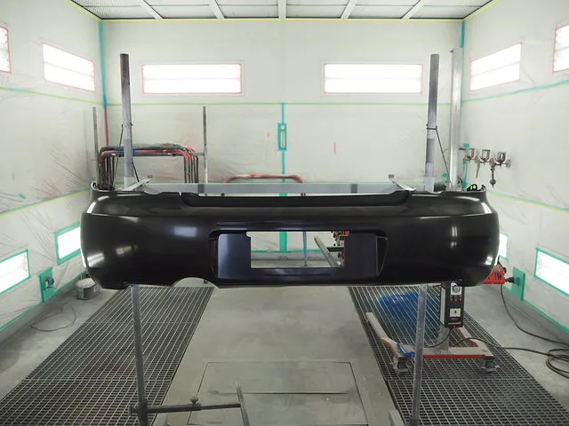 新品のバンパーには色がまだついていないので、塗装ブースという塗装専門の部屋で塗装をしていきます。