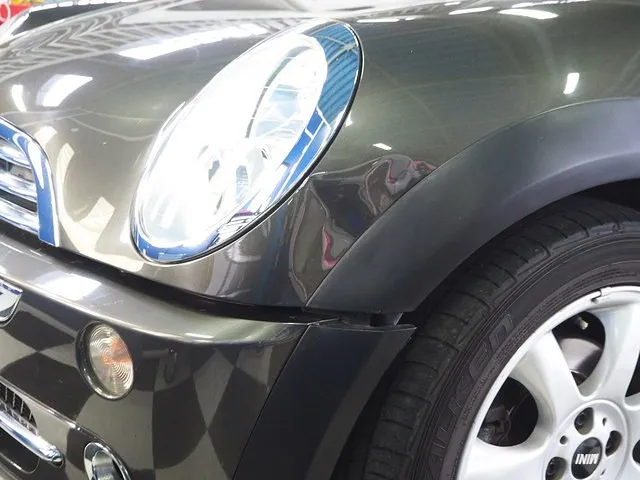 BMW ミニクーパー ボンネットの左ヘッドライトの左下付近が大きくへこんで潰れてしまっています。