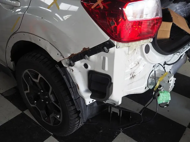 スバル XV リヤバンパー 左リヤフェンダー 左リヤテールレンズ 変形して大破しています。