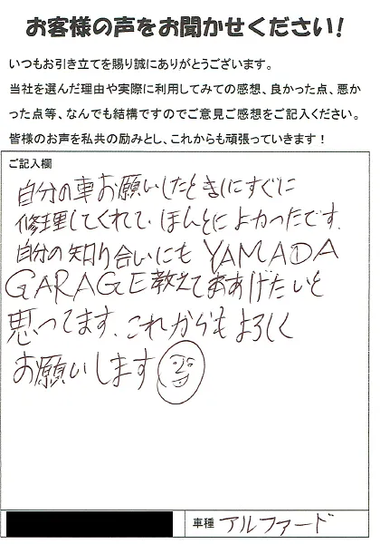 燕市 お客様の声 ヤマダガレージ