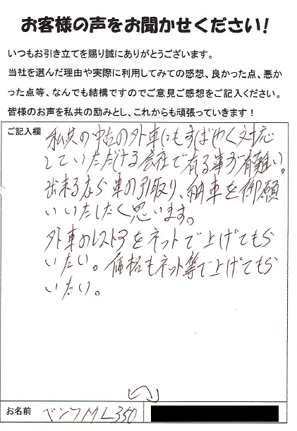 《お客様の声》私共の中古の外車にもすばやく対応していただける会社で有る事が有難い。