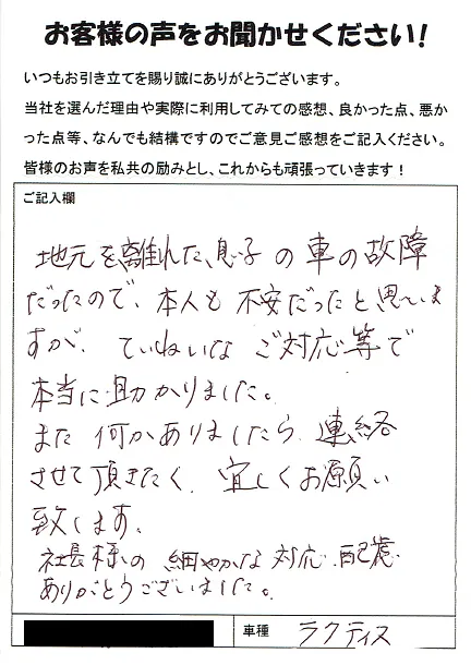 《お客様の声》地元を離れた息子の車の故障だったので、本人も不安だったと思いますが、ていねいなご対応等で本当に助かりました。