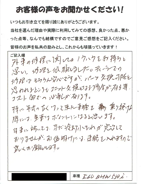 《お客様の声》外車の修理に関してのノウハウをお持ちと思い、修理を依頼しました。ディーラーでの修理はもちろん安心ですが、パーツ交換可能と思われるところもユニット交換となる場合が有る等、コスト面での心配が有ります。