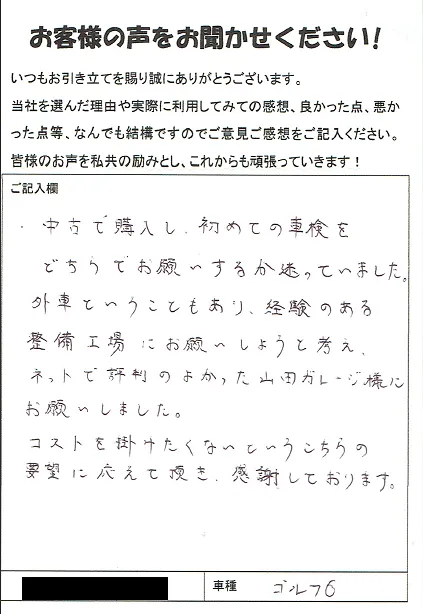 《お客様の声》中古で購入し、初めての車検をどちらでお願いするか迷っていました。