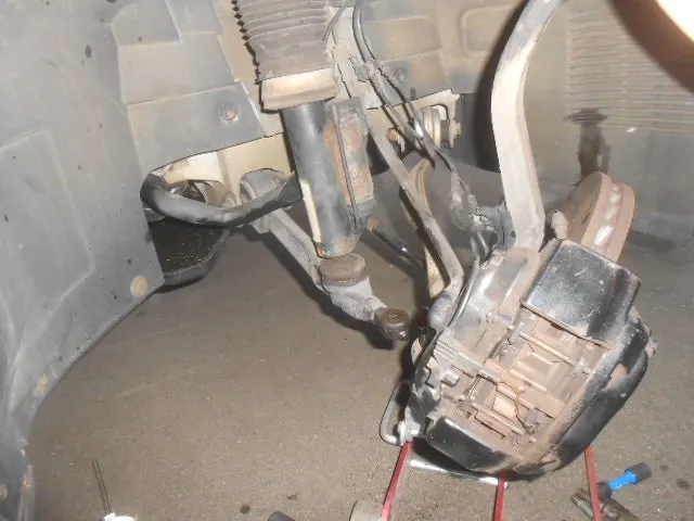 異音がする前輪のサスペンションを分解し点検し原因を探します。