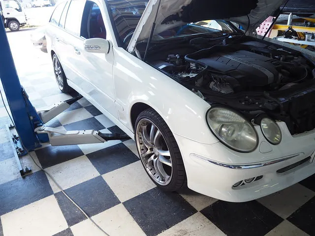 メルセデスベンツ E320 点検修理、車検整備、きずへこみの板金塗装などお気軽にお問い合わせください。