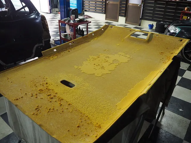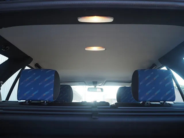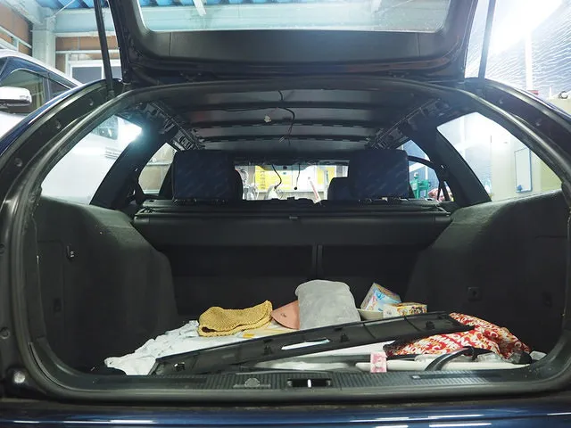 内装を分解して天張り ルーフトリムを取り外します。ワゴンタイプの車両はバックドアをあけて天張りを引き出せます。
