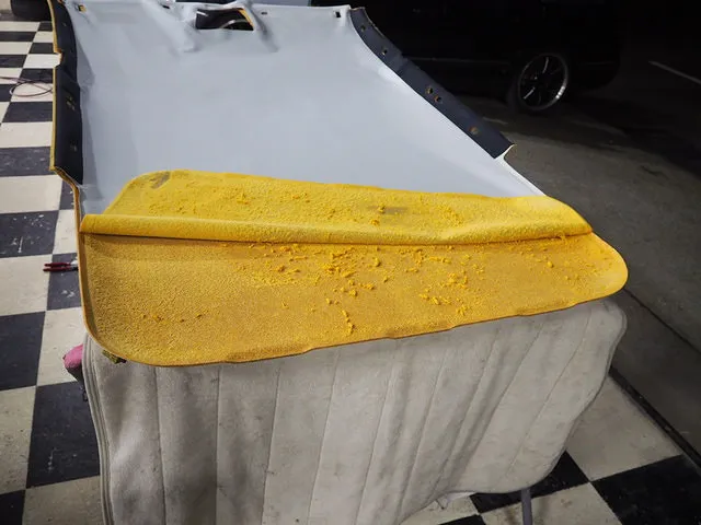 屋根の天張り ルーフトリムが垂れ下がってきました。輸入車では非常によくある事例です。