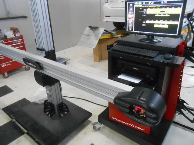 4輪アライメントテスターで現在のサスペンションの状態を調べます。