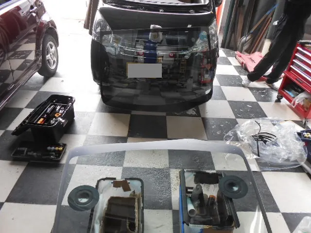 フロントガラスは車体に接着してありますので切り離すのも大変です。接着剤の乾燥時間も必要ですので納車は翌日になります。純正ガラス(メーカー品で安心ですが高価)社外ガラス(低価格)などお選びいただけます。